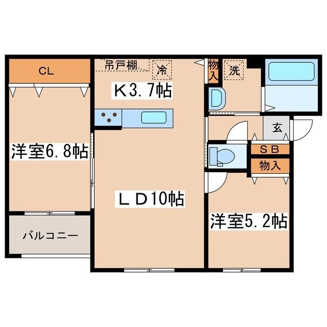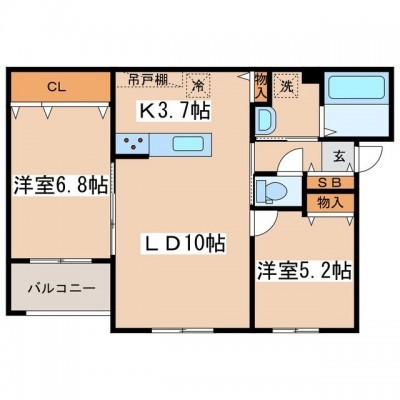 2LDK(58.8m²)└ LD10帖 K3.7帖 洋室6.8帖 洋室5.2帖