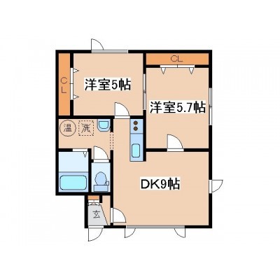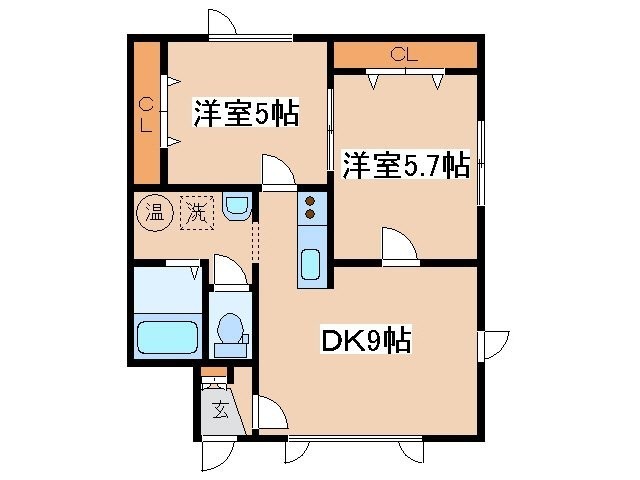 2DK(44.3m²)└ DK9帖 洋室5.7帖 洋室5帖