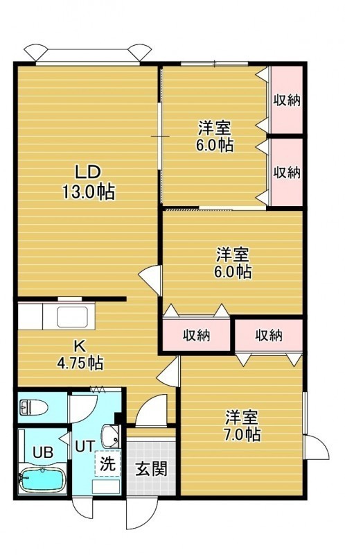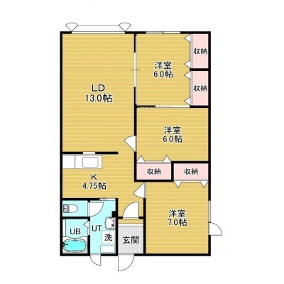 3LDK(77.76m²)└ 1階:LD13帖 K4.75帖 洋室6帖 洋室6帖 洋室7帖