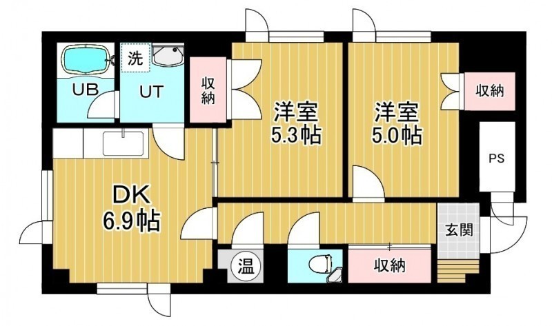 2DK(49.81m²)└ 2階:DK6.9帖 洋室5.3帖 洋室5帖