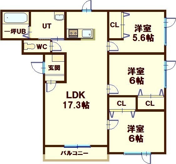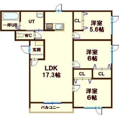3LDK(77.38m²)└ LDK17.3帖 洋室6帖 洋室6帖 洋室5.6帖