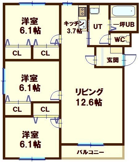 3LDK(75.13m²)└ LD12.6帖 K3.7帖 洋室6.1帖 洋室6.1帖 洋室6.1帖