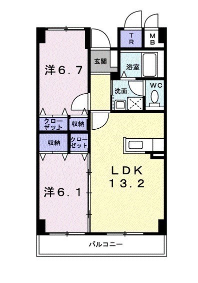 2LDK(58.67m²)└ 3階:LDK13.2帖 洋室6.7帖 洋室6.1帖