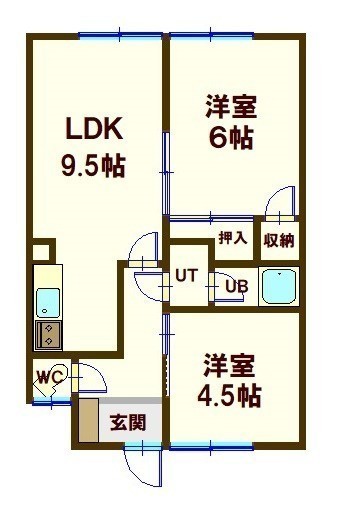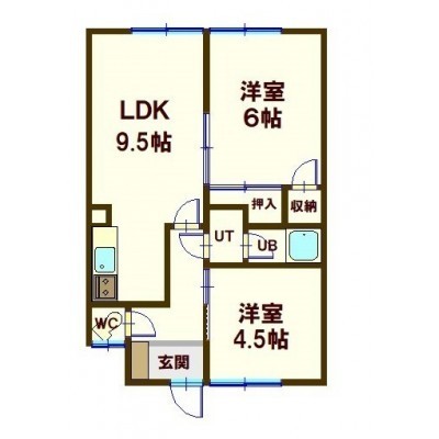 2LDK(46.3m²)└ 1階:LDK9.5帖 洋室6帖 洋室4.5帖