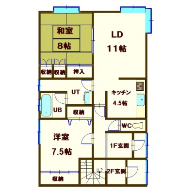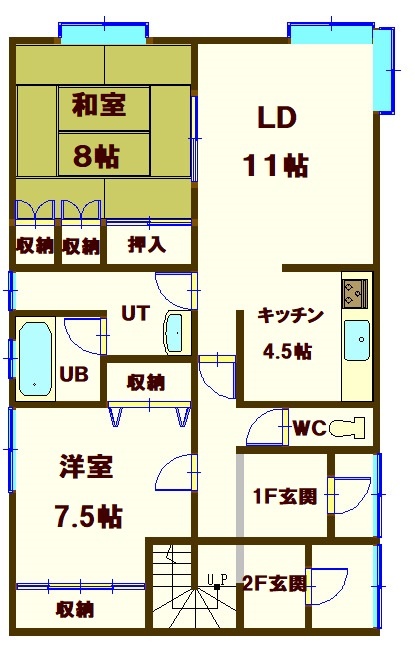 2LDK(76.14m²)└ 1階:LD11帖 洋室7.5帖 和室8帖 K4.5帖