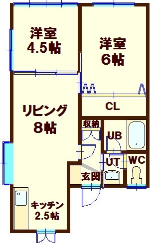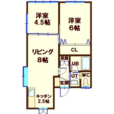 2LDK(45.04m²)└ 2階:DK8帖 洋室6帖 洋室4.5帖 / その他:K2.5帖