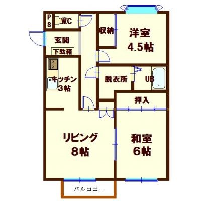 2LDK(46.28m²)└ 2階:LD8帖 和室6帖 洋室4.5帖 K3帖