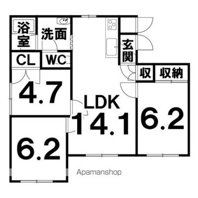 3LDK(65.06m²)└ 洋6.2×洋6.2×洋4.7×LDK14.1