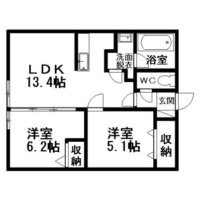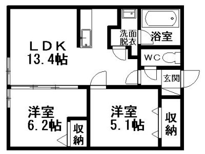 2LDK(51.3m²)└ LDK13.4×洋6.2×洋5.1