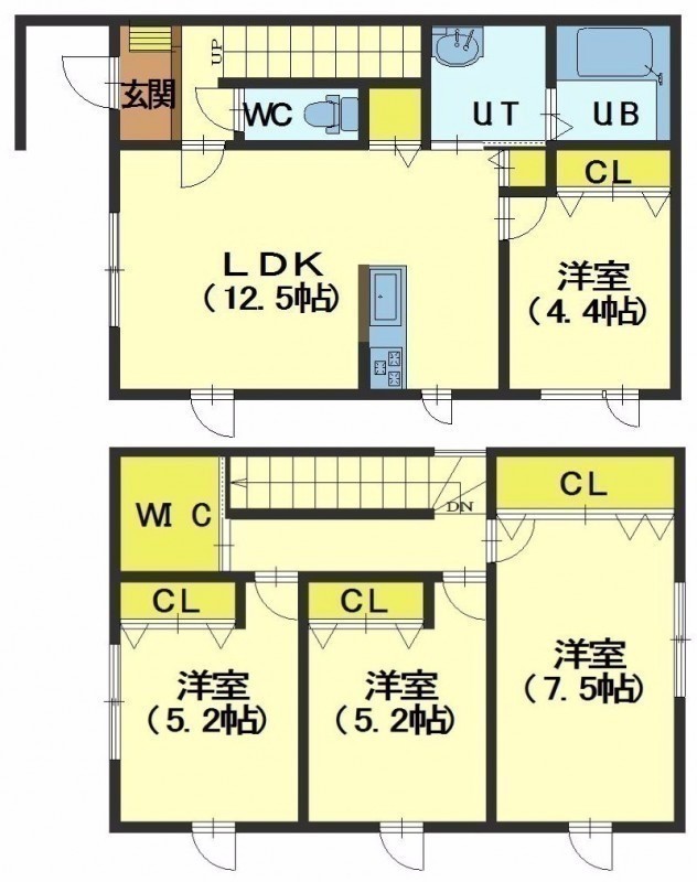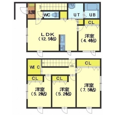 4LDK(90.08m²)└ 1階:LDK12.5帖 洋室4.4帖 / 2階:洋室7.5帖 洋室5.2帖 洋室5.2帖