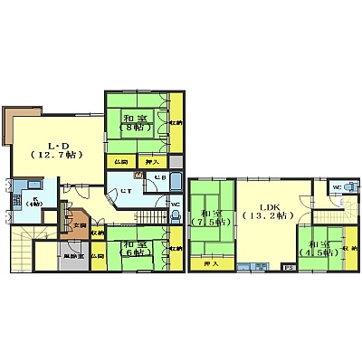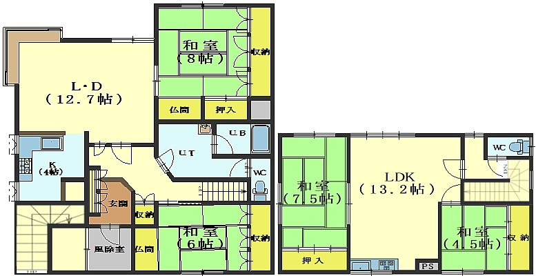 4LDK(144.49m²)└ 1階:LDK13帖 / 2階:LDK13.2帖 / その他:和室8帖 和室6帖 和室7.5帖