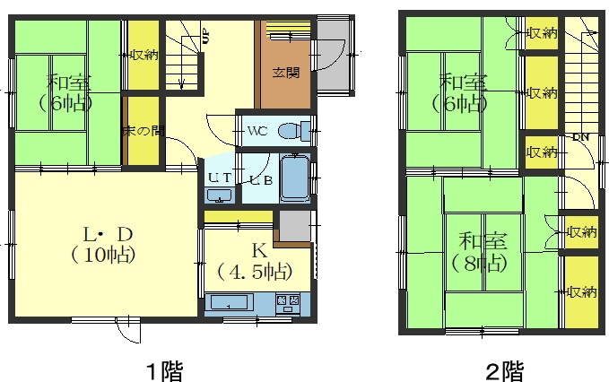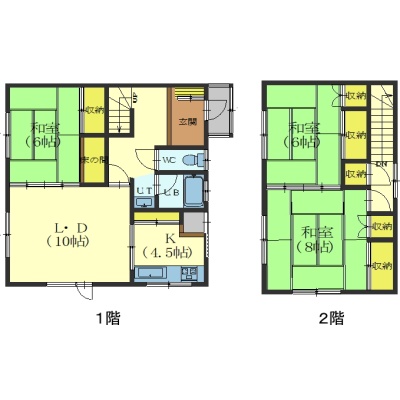 3LDK(85m²)└ 1階:LD10帖 K4.5帖 和室6帖 / 2階:和室6帖 和室8帖