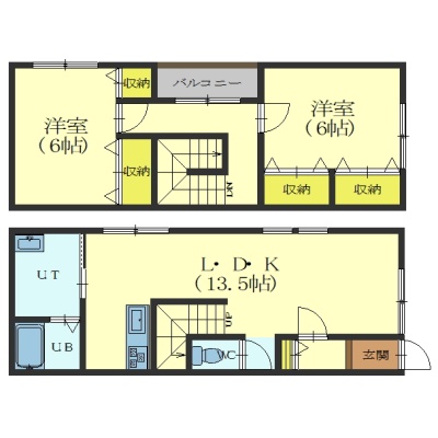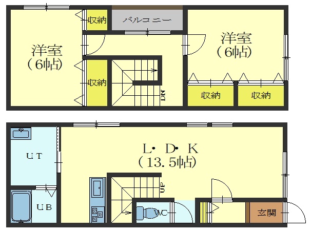 2LDK(70.38m²)└ 1階:LDK13.5帖 / 2階:洋室6帖 洋室6帖