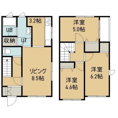 3LDK(78.3m²)└ 1階:LD8.5帖 K3.2帖 / 2階:洋室6.2帖 洋室5帖 洋室4.6帖