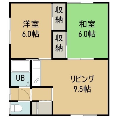 2LDK(45.36m²)└ 2階:LDK9.5帖 洋室6帖 和室6帖
