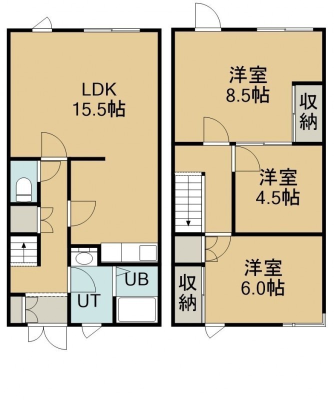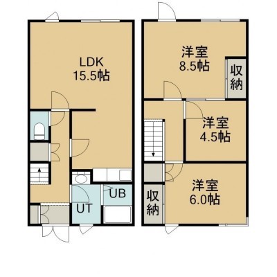 3LDK(82.47m²)└ 1階:LDK15.5帖 / 2階:洋室8.5帖 洋室6帖 洋室4.5帖
