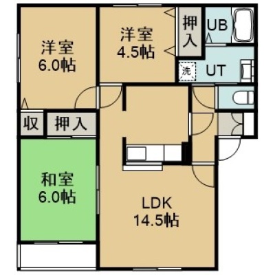 3LDK(65.82m²)└ 1階:LDK14.5帖 洋室6帖 洋室4.5帖 和室6帖