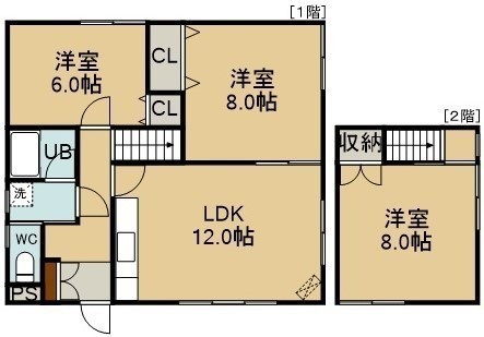 3LDK(73.69m²)└ 1階:LDK12帖 洋室8帖 洋室6帖 / 2階:洋室8帖