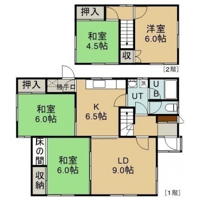 4LDK(87.19m²)└ 1階:LD9帖 K6.5帖 和室6帖 和室6帖 / 2階:洋室6帖 和室4.5帖