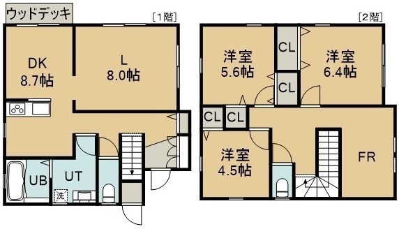3LDK(98.43m²)└ 1階:L8帖 DK8.7帖 / 2階:洋室6.4帖 洋室5.6帖 洋室4.5帖