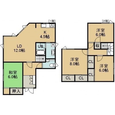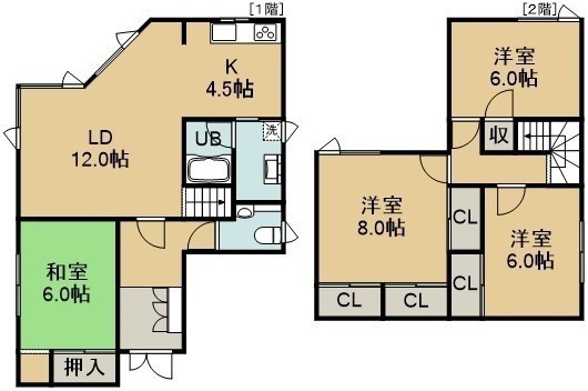 4LDK(104.13m²)└ 1階:LD12帖 K4.5帖 和室6帖 / 2階:洋室8帖 洋室6帖 洋室6帖