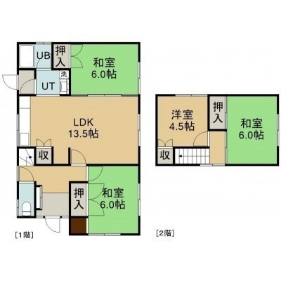 4LDK(83.21m²)└ 1階:LDK13.5帖 和室6帖 和室6帖 / 2階:和室6帖 洋室4.5帖