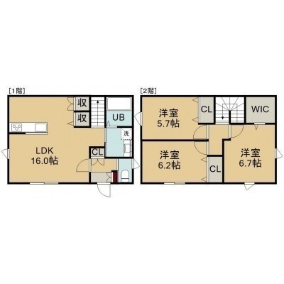 3LDK(84.46m²)└ 1階:LDK16帖 / 2階:洋室6.7帖 洋室6.2帖 洋室5.7帖