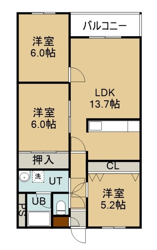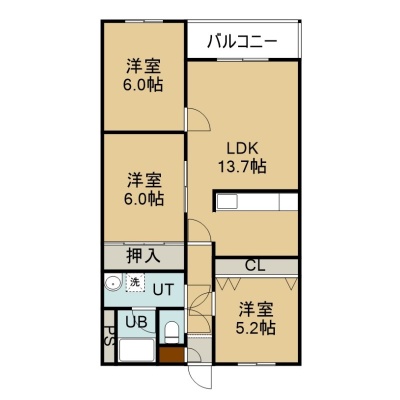 3LDK(69.77m²)└ 3階:LDK13.7帖 洋室6帖 洋室6帖 洋室5.2帖