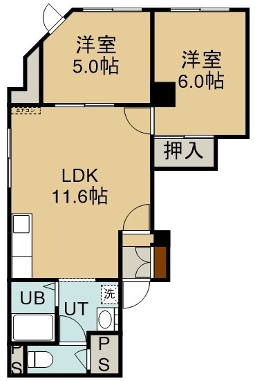 2LDK(42.41m²)└ 2階:LDK11.6帖 洋室6帖 洋室5帖
