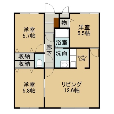 3LDK(72m²)└ 2階:LD12.6帖 K2帖 洋室5.8帖 洋室5.7帖 洋室5.5帖