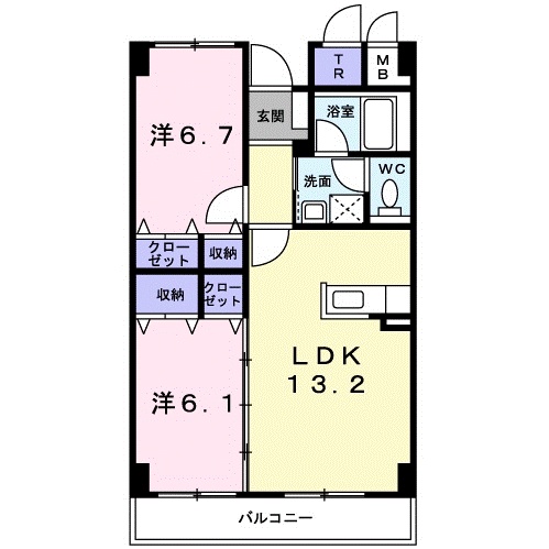 2LDK(58.67m²)└ 2階:LDK13.2帖 洋室6.7帖 洋室6.1帖