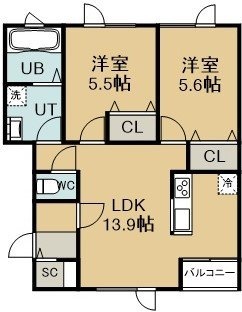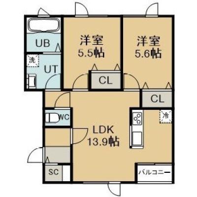 2LDK(56.02m²)└ 2階:LDK13.9帖 洋室5.6帖 洋室5.5帖
