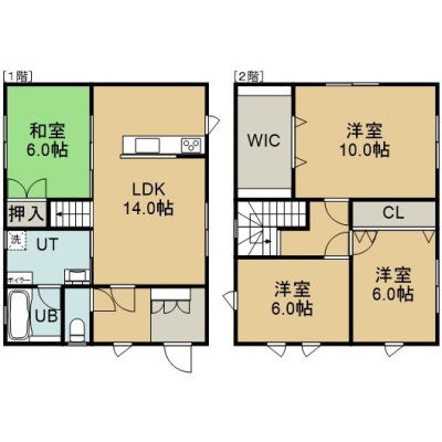 4LDK(104.34m²)└ 1階:LDK14帖 和室6帖 / 2階:洋室10帖 洋室6帖 洋室6帖