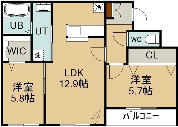 2LDK(57.14m²)└ 3階:LDK12.8帖 洋室5.8帖 洋室5.7帖