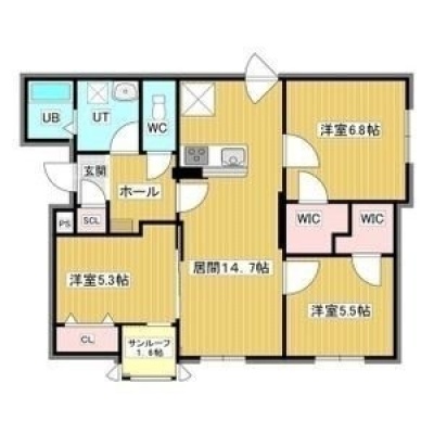 3LDK(74.42m²)└ 2階:LDK14.7帖 洋室6.8帖 洋室5.5帖 洋室5.3帖
