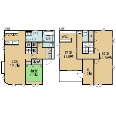 3SLDK(125.73m²)└ 1階:LDK18帖 和室4.5帖 / 2階:洋室14.75帖 洋室11.5帖 S4.5帖