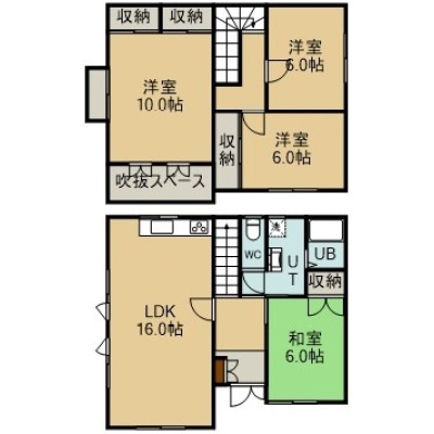 4LDK(115.51m²)└ 1階:LDK16帖 和室6帖 / 2階:洋室10帖 洋室6帖 洋室6帖