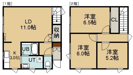 3LDK(73.54m²)└ 1階:LD11帖 K3帖 / 2階:洋室6.5帖 洋室6帖 洋室5.2帖