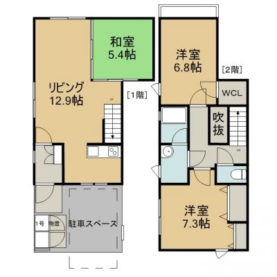 3LDK(75.2m²)└ 1階:LD12.9帖 K3.2帖 和室5.4帖 / 2階:洋室7.3帖 洋室6.8帖