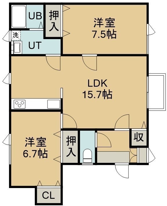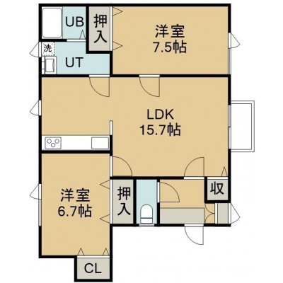 2LDK(60m²)└ 2階:LDK15.7帖 洋室7.5帖 洋室6.7帖