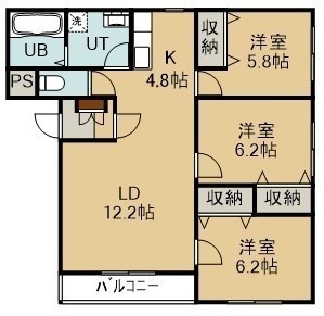 3LDK(71.6m²)└ 2階:LD12.2帖 K4.8帖 洋室6.2帖 洋室6.2帖 洋室5.8帖