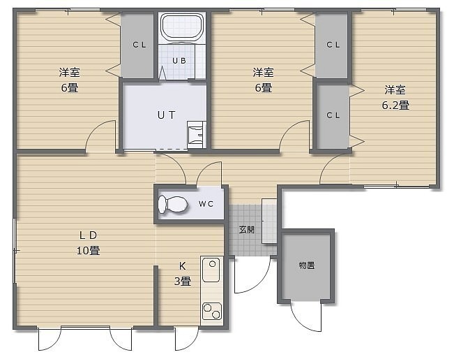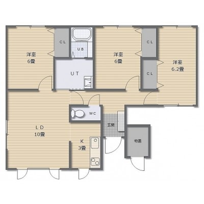 3LDK(73.42m²)└ LD10帖 K3帖 洋室6.2帖 洋室6帖 洋室6帖