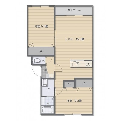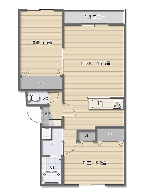 2LDK(65.46m²)└ LDK15.3帖 洋室6.5帖 洋室6.2帖