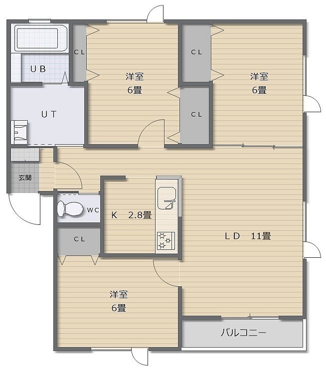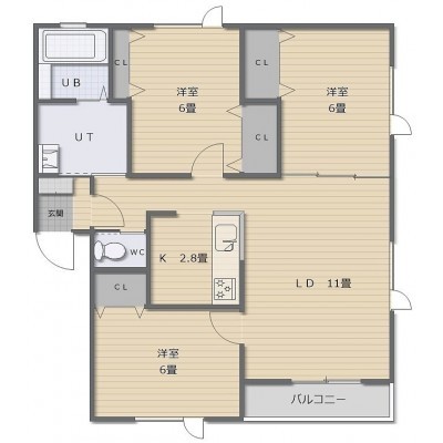 3LDK(76.39m²)└ LD11帖 K2.8帖 洋室6帖 洋室6帖 洋室6帖