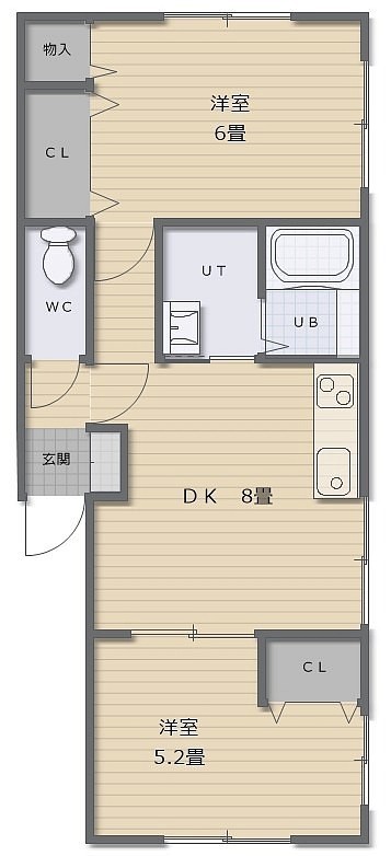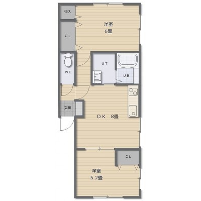 2DK(45.55m²)└ DK8帖 洋室6帖 洋室5.2帖