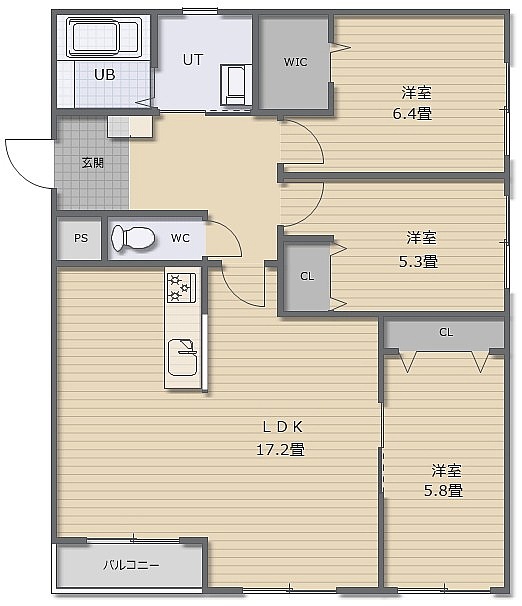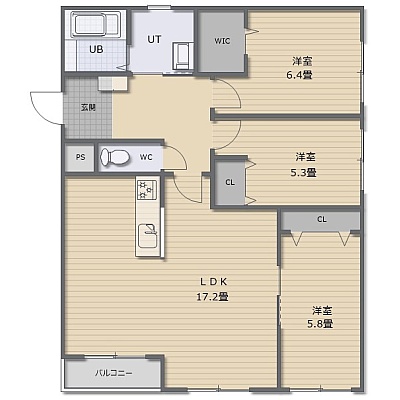 3LDK(77.5m²)└ LDK17.2帖 洋室6.4帖 洋室5.8帖 洋室5.3帖