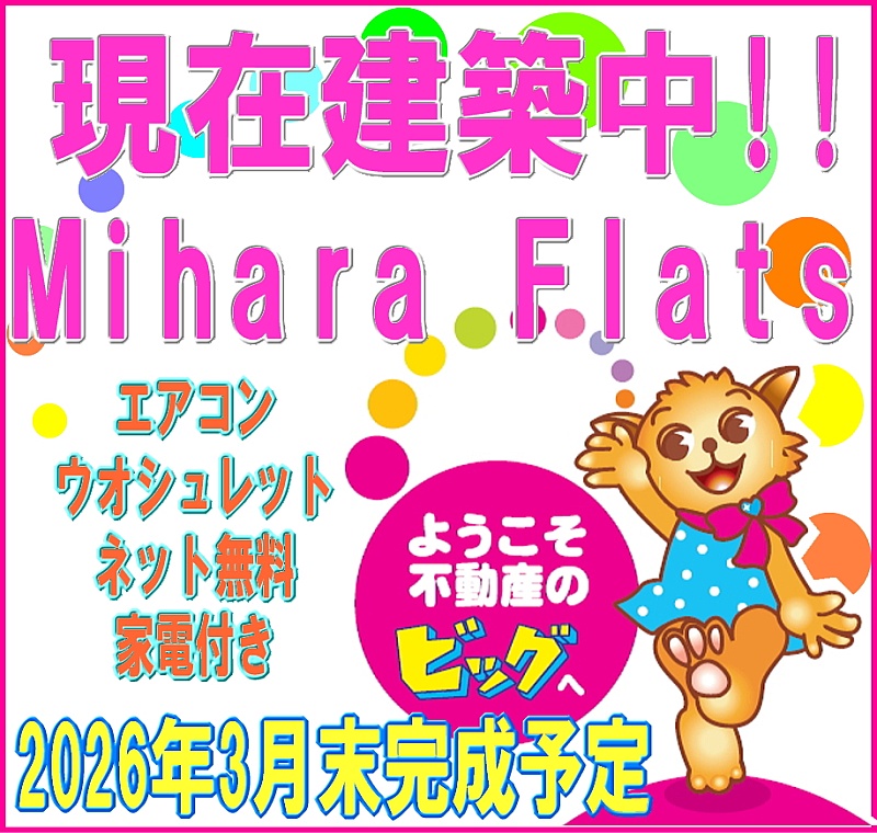 ここに注目!Mihara Flats【ミハラ フラッツ】は、2026年3月下旬入居開始予定の現在建築中のアパートです。新しい生活を始めるあなたにぴったりの1Kのお部屋です。 新生活をスムーズにスタートできるよう、テレビ、冷蔵庫、洗濯機、電子レンジ、パイプベッドといった家具家電が備え付けなのが嬉しいポイント。さらに、インターネット利用料無料なので、月々の費用を抑えながら快適なネット環境をお楽しみいただけます。 バス・トイレ別、独立洗面台、温水洗浄トイレなど水回りも充実しており、ウォークスルークローゼットやシューズボックスで収納もたっぷり。宅配BOXも完備しているので、お忙しい方にも便利です。 周辺には徒歩圏内にスーパー(6分)、ドラッグストア(4分)、コンビニ(7分)があり、日々のお買い物にも困りません。保証人不要でご契約いただけますので、お気軽にご相談ください。Mihara Flatsで、快適で安心な新生活を始めてみませんか?