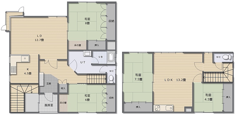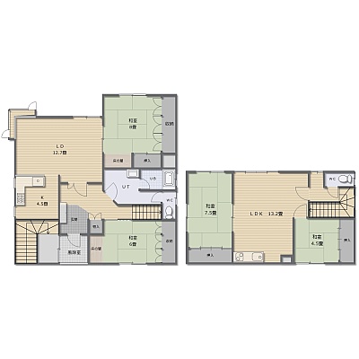 4LDK(144.49m²)└ 2階:LDK13帖 和室8帖 和室6帖 / 3階:LDK13.2帖 和室7.5帖 和室4.5帖