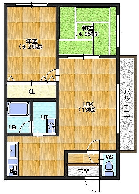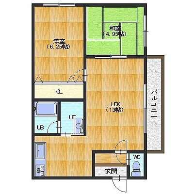 2LDK└ LDK13帖 洋室6.25帖 和室4.95帖