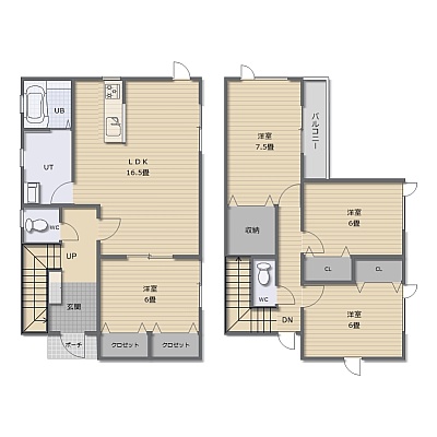 4LDK(109.29m²)└ 1階:LDK16.5帖 洋室6帖 / 2階:洋室7.5帖 洋室6帖 洋室6帖
